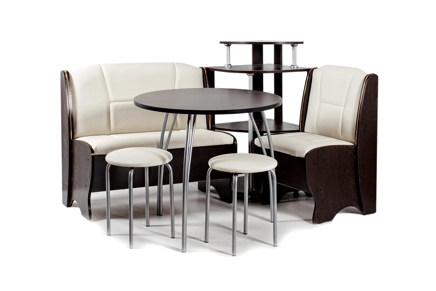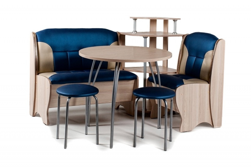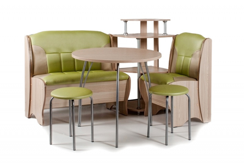 Особенности уголка: Состоит из 2 скамей, этажерки, стола и табуретов. Термостойкая пластиковая столешница. Угол собирается как в правом, так и в левом исполнении. Имеется удобная полочка для мелких предметов. Высота от пола до сидения: 450 мм.