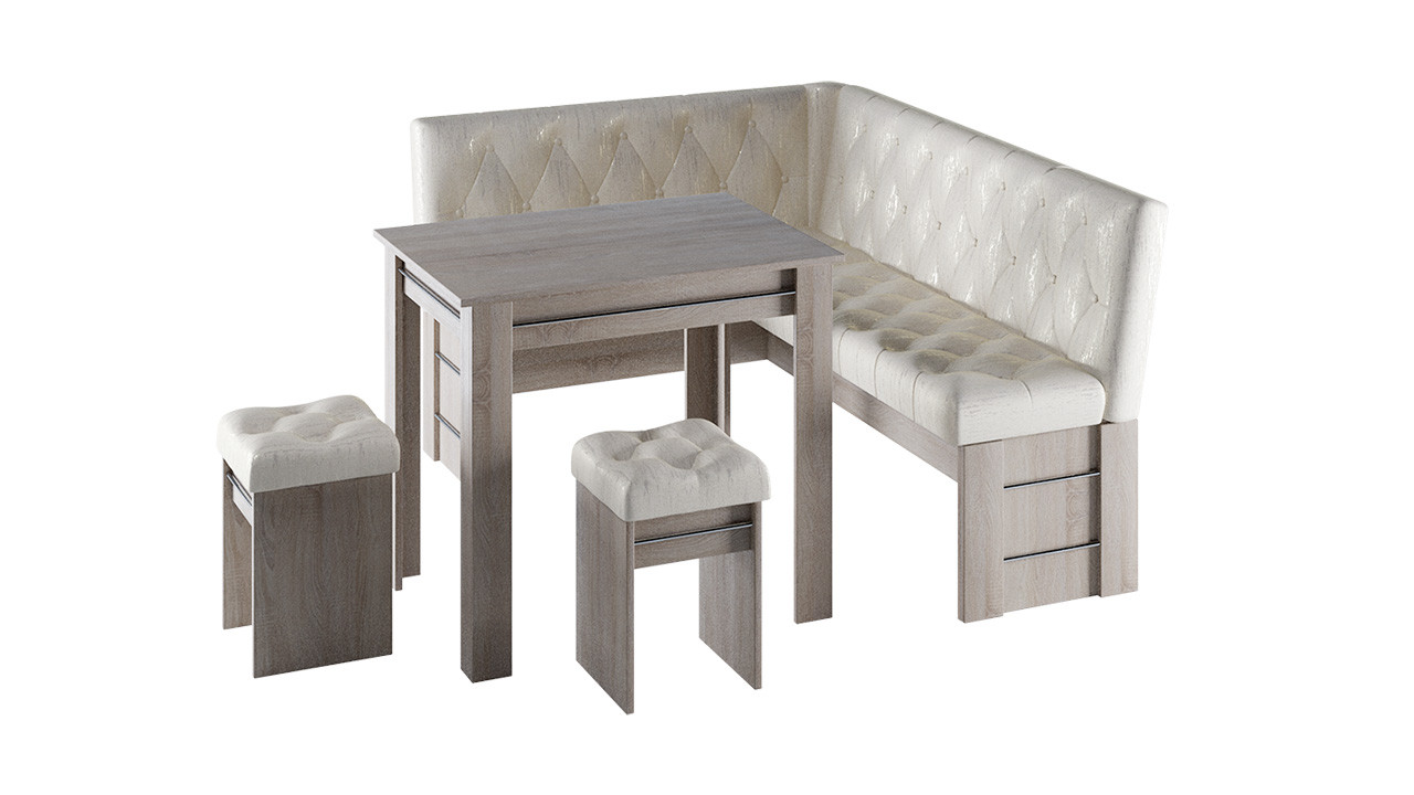 • Обеденная зона "Памела" состоит из удобной угловой скамьи, практичного стола и компактных табуретов.